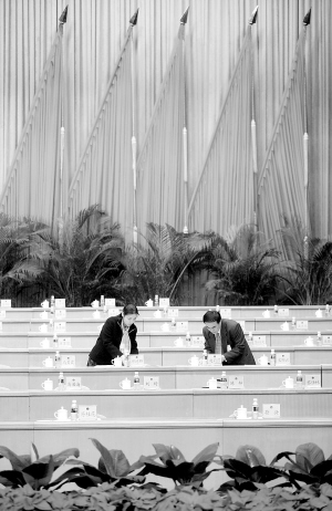 ↑在海南省第四届人民代表大会第二次会议开幕式前,工作人员在认真摆放主席台代表座位上的会议材料。 本报记者 宋国强 摄