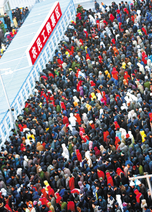 春运刚刚开始,铁路北京西站就迎来购票高峰,广场上的农民工购票区人山人海。 新华社发(吴长青 摄)