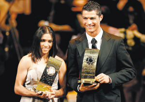 | C罗(右)与世界足球小姐巴西女球星玛塔在领奖台上。 新华社发