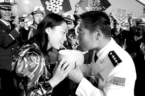 1月11日,南海某军港,艳阳高照,春暖花开,南海舰队某部“余庆”艇官兵在甲板上为一对幸福的新人———曾经因执行任务而三次推迟婚礼的该艇副艇长陈达和美丽热情的“湘妹子”庞燕,举行了一个浪漫而热烈的婚礼。水兵们把自己亲手摘下来的“连心椰子”献给这对有情人,让大海为媒,蓝天作证,祝福他们的生活像鲜花一样美丽,像椰汁一样甜蜜。 文/王红卫 图/朱光耀