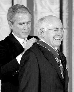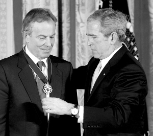 1月13日,美国总统布什在华盛顿白宫为澳大利亚前总理约翰·霍华德(左图)、英国前首相布莱尔(右图)颁发总统自由勋章,感谢其长期以来给与美国的坚定支持。 新华社/路透