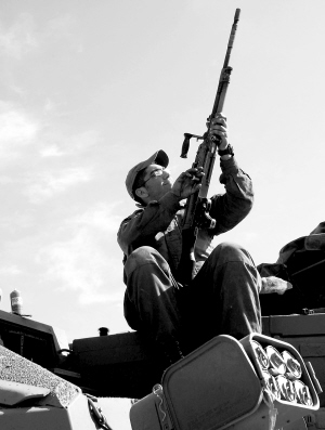 | 1月13日,在加沙地带边境地区,一名以色列预备役士兵坐在装甲车上检查枪支。 新华社发 |