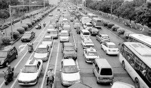 | 汽车在海口街头排成长龙。 本报记者 李英挺 摄 |