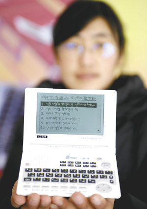 中国第一款藏汉英电子词典硬件产品《洛藏藏汉英电子词典》在拉萨问世。词典由西藏大学教师洛藏研发,共收录34本藏汉英词典所包含的词汇,实现藏汉英三个文种之间互译,同文种在多个词典里可实现同步查询;收录了25部百科类电子书籍。 新华社发