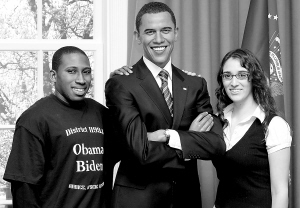 1月15日,在伦敦的杜莎夫人蜡像馆,两名美国国际大学的学生与美国当选总统奥巴马的蜡像合影。 新华社/法新