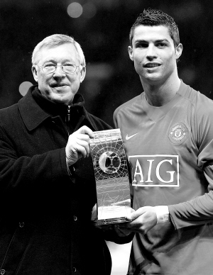 1月15日,新当选世界足球先生的C罗(右)与曼联队主帅弗格森,捧世界足球先生奖杯合影。当日,曼联队在英超的一场补赛中,主场1比0战胜威根队。 新华社发