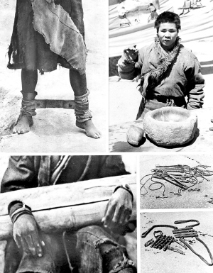 | 原西藏地方政府对农奴实行的酷刑:图左上为足械刑。左下为手械刑。右下为鞭笞人的法鞭和夹手指刑具。右上为被挖去双眼的农奴格达在民主改革中控诉农奴主的罪行:农奴主将沉重的石帽戴在农奴头上,用石头敲击将眼珠挤压出来,再用利刀把眼珠剜下。(资料照片) 新华社发 |