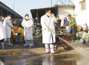 | 1月7日,三河市畜牧、防疫部门工作人员正在燕郊行宫市场活禽交易区消毒。 (资料照片) 新华社记者 曹国厂 摄 |