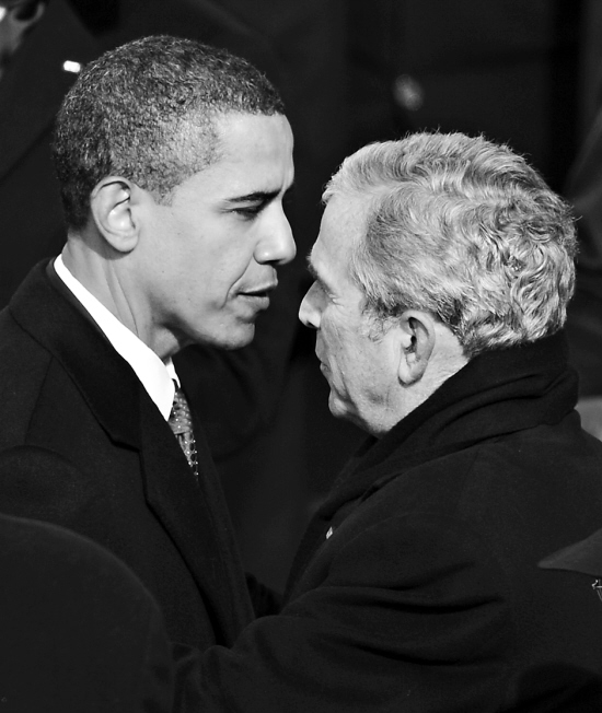 1月20日,美国新任总统贝拉克·奥巴马(左)与前任总统乔治·W·布什(右)在就职典礼上交换意见。当日,布什完成了他的第二个总统任期,奥巴马宣誓就任美国第44任总统。 新华社/法新 权力交替