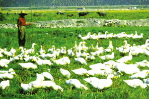 在村附近的一片田洋地里,记者看见到处都是鸭子觅食、嬉戏的景象,一派田园风光。看着长得肥肥的、长势喜人的鸭子,村民李和成高兴地说,再过一个月就可以上市了,如果市场行情好的话,按平均每只鸭收入20元左右计算,就可以净赚2万多元。