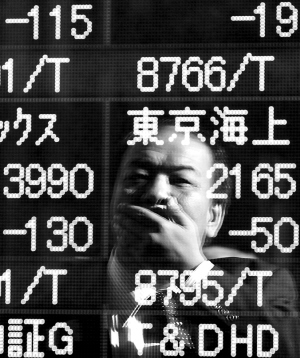 1月23日,一名男子望着日本东京的一个股指显示屏。受前一个交易日纽约股市下挫和日本国内企业业绩恶化等因素影响,当天东京股市日经225种股票平均价格指数大幅下跌3.81%。 新华社/路透
