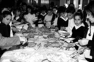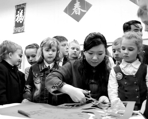 ← 在白俄罗斯首都明斯克市,白俄罗斯国立艺术研究院中国留学生孟丽(前右二)为白俄罗斯小朋友表演剪纸。