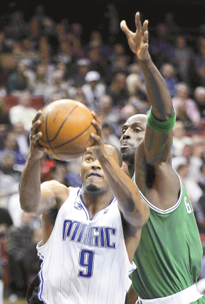 1月22日,在NBA常规赛中,凯尔特人队以90:80战胜奥兰多魔术队。另一场比赛中湖人117:97胜奇才。图为凯尔特人队球员加内特(右)在比赛中防守魔术队球员刘易斯的上篮。 新华社发