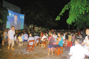 | ←昌江电影公司在昌化镇放映电影,吸引众多村民前来观看。