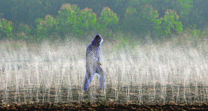 1月23日,东方市八所镇罗带村香蕉种植基地,农民调试刚安装的喷灌系统。 据悉,以前采用的漫灌直灌式的传统灌溉技术对水的利用率不到40%,而运用滴灌、微喷灌等节水设备,水的利用率可高达90%以上,具有节水性能好、省工、增效等特点。 本报记者 李英挺 摄