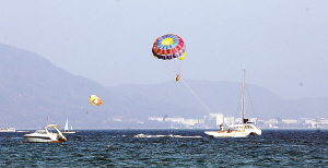 | 游人乘坐拖曳伞在亚龙湾的海面上飞行,欣赏亚龙湾美景。 本报记者 程范淦 摄 |