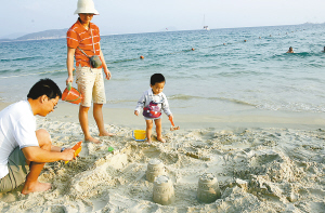 | 在温煦的阳光底下,亚龙湾沙滩上一家三口筑沙城。 本报记者 程范淦 摄 |