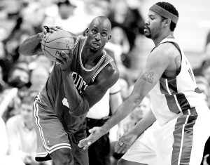 | 1月31日,在NBA常规赛中,波士顿凯尔特人队客场以86比78战胜底特律活塞队。图为凯尔特人队球员加内特(左)带球突破。 新华社发 |