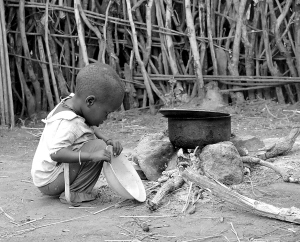 →2月3日,在乌干达东北部的莫罗托地区,一名儿童等待煮熟的食物。受东北部地区旱灾影响,目前乌干达国内超过97万人面临着严重饥荒的威胁。当地人道主义机构说,灾民们已经开始食用野果、树叶以求生存。联合国世界粮食计划署和乌干达政府已共同启动一项总值6400万美元的紧急援助计划,帮助灾民渡过难关。 新华社发