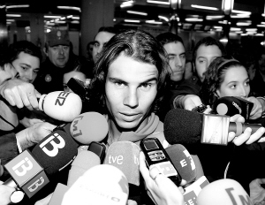 2月4日,获得2009年澳大利亚网球公开赛男单冠军的西班牙选手纳达尔回国,在机场受到了来自球迷和媒体的热烈追捧。图为抵达机场的纳达尔(中)被媒体围堵。 新华社发