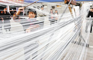 2月4日,市民在福州市第二届闽都民俗文化节上展示榕城传统手工线面加工工艺。筷子粗的面条在能工巧匠手里,几分钟就变成了柔韧如线的线面。 新华社记者 张国俊 摄