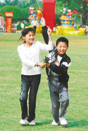 | 来自四川汶川三江乡的小姐弟在万绿园放风筝。 本报记者 张苏民 摄 |