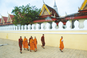 参观王宫是柬埔寨之旅的经典项目。绕过独立纪念碑,汽车行驶不久就到了王宫参观点的入口处。在这里,我看到三五个身穿袈桬的僧侣说笑着从王宫的墙外走过。这些僧侣很大方,他们并不回避我们的镜头,相反还冲着我们招手微笑。柬埔寨是个佛教国家,全国1300万人口中,有85%以上的人信奉佛教。年轻的僧侣在街道上微笑地走过,橙色和深红色的袈桬在城市里飘来飘去,是这个城市最独特的风景。