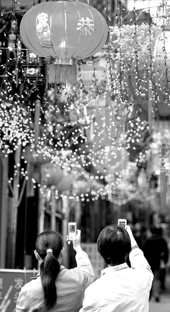 2月8日,在海口市府城镇绣衣坊,各式各样俏丽的花灯流光溢彩,吸引市民驻足观看。 本报记者 张杰 摄