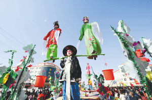 2月9日,绑在铁支架高处的孩童随着“踩街”的车辆缓慢前行,这种表演形式被称作“铁芯子”。当日,位于甘肃省东部的庆阳市环县举行万人“踩街”活动,群众演员走上街头,舞狮子、踩高跷、扭秧歌,与市民们共庆元宵佳节。 新华社记者 韩传号 摄