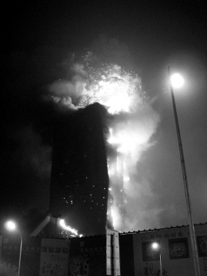 着火的是央视主体大楼北侧的配楼“北京文化东方酒店”。该酒店建筑高约一百三四十米,东、南两面着火。东面的火势已被消防人员控制,南面的火仍在燃烧,火势有80米到100米高。楼内是否有人目前无法得知。现场已有五十多辆消防车。截至9日23时20分,着火楼体外面的火已扑灭,消防人员正在设法控制楼内的火势。据现场工地的一名工人说,着火可能是燃放烟火所致。火灾的真正原因有待消防机关进一步调查。6名消防官兵在扑救央视新址火灾中受伤,目前已送到附近医院救治。 新华社发