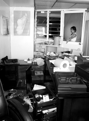 | 图为工作人员在遭洗劫的华商图片洗印店内忙碌。 新华社发 |