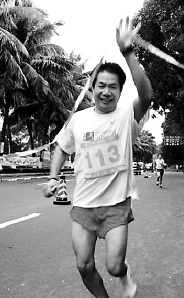 | 钟锡棠在2009年元旦举行的海口马拉松赛上冲剌。 张工 摄 |
