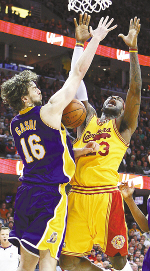 2月8日,在2008-2009赛季NBA常规赛中,洛杉矶湖人队客场以101比91战胜克里夫兰骑士队。图为洛杉矶湖人队球员加索尔(左)在比赛中防守。新华社发