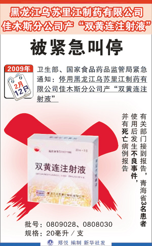 今年2月11日,卫生部、国家食品药品监管局接到青海省报告,青海省大通回族土族自治县3名患者使用标识为黑龙江乌苏里江制药有限公司佳木斯分公司生产的双黄连注射液(批号:0809028、0808030,规格20毫升/支)发生不良事件,并有死亡病例报告。