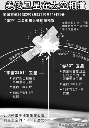 俄罗斯航天兵11日证实,俄罗斯和美国两颗卫星在太空相撞。航天兵第一副司令亚历山大·亚库申说,“宇宙2251”号1993年从俄罗斯西北部阿尔汉格尔斯克州普列谢茨克发射场升空,1995年起停止运行。