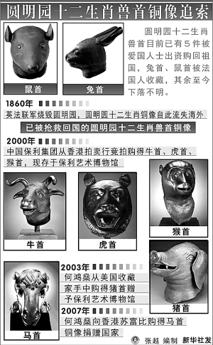 兔首和鼠首铜像是圆明园流失的著名文物“12生肖兽首”中目前所能确定的仍流落海外的两件。“12生肖兽首”在第二次鸦片战争时期流失,目前已经回归的有五件:牛首、猴首、虎首、猪首、马首,另外五件龙首、蛇首、羊首、鸡首、狗首铜像至今下落不明。“12生肖兽首”原位于圆明园一个扇形喷水池上,各个铜像会按照它所代表的12个时辰依次喷水报时。