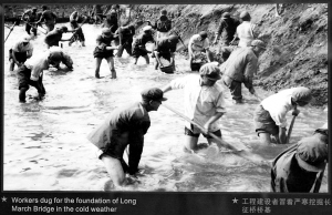| 西昌卫星发射中心建设初期,建设者冒着严寒挖掘长征桥桥基。