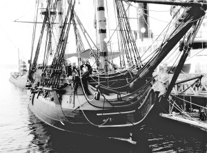 | 美国加利福尼亚州的圣迭哥城海边停靠的古海盗船。 周伟民 摄 |