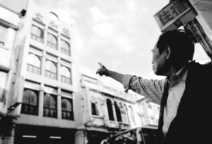 | 在海口市博爱北路67号,吴梅老人指认当年的胜间田商行。 海南日报记者 张杰 摄 |