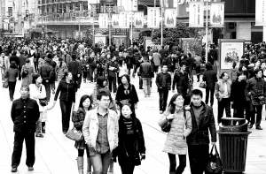 2月15日,上海市南京路上人流如织。 日前公布的《2008年上海市国民经济和社会发展统计公报》显示,至2008年末,上海全市常住人口总数达1888.46万人。 新华社发