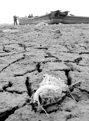 这是在嵩县陆浑水库龟裂的库底内,一条被鸟类啄食过的死鱼。 位于河南省西部伏牛山深处的嵩县,从2008年11月中旬以来,降水量仅有8毫米,较常年同期平均值减少9成多,为1965年以来的最少值。截至目前,由于人畜吃水困难面积较大、人口较多、基础设施薄弱,当地山区农村人畜吃水困难的状况还有日趋严重的趋势。 新华社记者 王颂 摄