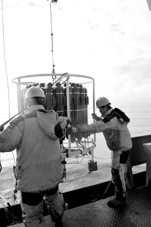 2月15日,考察队员在向海中投放测量温度、盐度、深度的CTD剖面仪。 “雪龙”号科考船目前正在对南极普里兹湾和埃默里冰架前缘进行大洋科考。 新华社记者 刘奕湛 摄