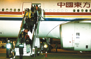 2月17日,游客家属和旅客正走下飞机舷梯。 当日,中国6位在美国旅游遭遇车祸遇难者遗体,由东航MU586次班机运送回国抵达上海,随机返回的还有遇难游客家属、受伤游客及家属等。 新华社发 赴美旅游团车祸遇难者 遗体运回上海
