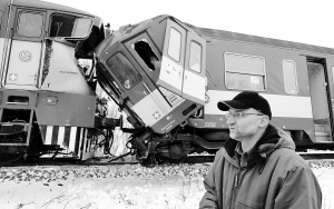 2月16日,在捷克奥斯特拉瓦附近,一名男子从两列相撞的客运火车前经过。 新华社/捷通社