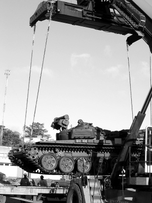 2月15日,在肯尼亚东部港口蒙巴萨,一辆坦克正在从乌克兰货船“法伊尼”号上被卸载下来。这艘船去年9月25日被索马里海盗劫持,直到本月初才获释。船上载有包括33辆T-72型主战坦克在内的大批武器装备,据称是肯尼亚军方采购的。 新华社发