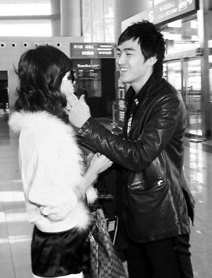 | 2月17日下午,冯潇霆从青岛流亭机场登上飞往韩国首尔的航班,开始自己的留洋之旅。图为冯潇霆在机场与女友道别。 小新发 |