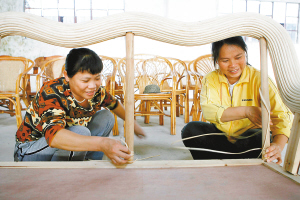 | 白沙黎族自治县因地制宜,积极发展林下经济。图为该县中环藤艺制品厂的工人在编藤椅。