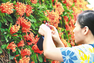 南山景区炮仗花争相怒放,点染南国之春,成为游客争相观看和拍照留念的一道美丽的风景。 三亚连续几天风和日丽,南山景区内的山坡上、岩石边、椰树旁,甚至围墙上,金黄鲜艳的炮仗花灿烂绽放。成串的花朵犹如一簇簇焰火,给三亚增添了不少喜庆色彩。对不少北方游客来说,还是头一次看到这火一般的花卉美景。 据景区工作人员介绍,炮仗花因花似炮仗而得名,南山景区的炮仗花每年春节前后开花,立春后进入盛放期,花期一般在一个月以上。 通讯员 陈文武 本报记者 程范淦 摄
