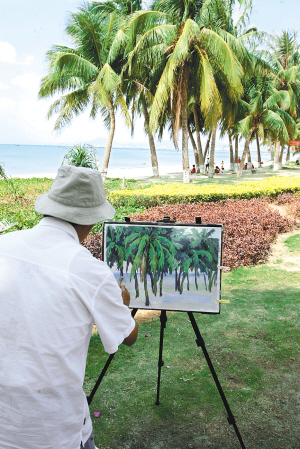三亚湾美景吸引众多游客。2月17日下午,一位从山西来的美术爱好者在这里用心描绘椰风海韵。 本报记者 程范淦 摄