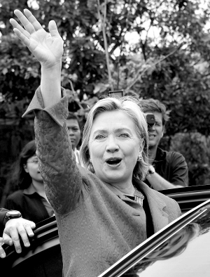 2月18日,在印度尼西亚首都雅加达的哈利姆军用机场,刚刚抵达印尼的美国国务卿希拉里向人们挥手致意。作为亚洲四国之行的第二站,希拉里将在印尼逗留两天。 新华社/法新